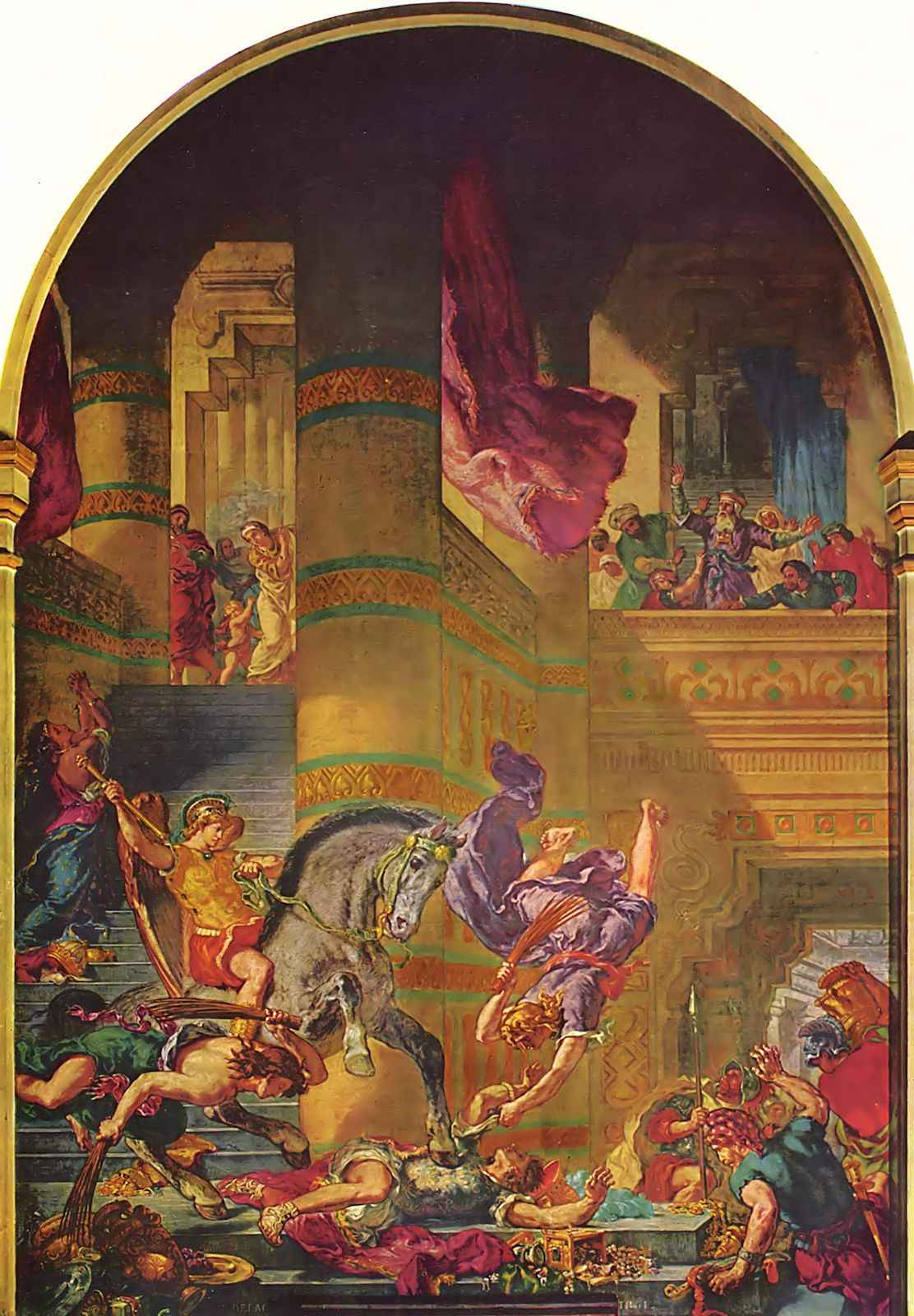 Cavaleiros celestes expulsam Heliodoro do Templo no início da rebelião Macabea.Eugène Delacroix (1798 — 1863). Saint-Sulpice, Paris